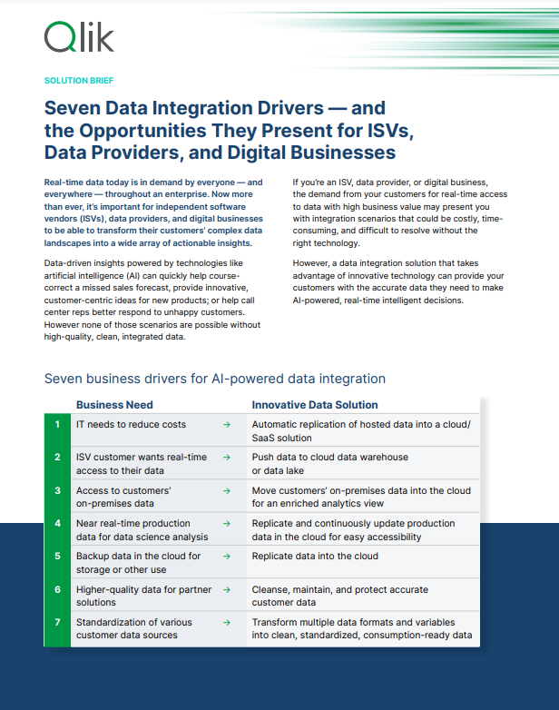 However none of those scenarios are possible without high-quality, clean, integrated data. If you’re an ISV, data provider, or digital business, the demand from your customers for real-time access to data with high business value may present you with integration scenarios that could be costly, timeconsuming, and difficult to resolve without the right technology. However, a data integration solution that takes advantage of innovative technology can provide your customers with the accurate data they need to make AI-powered, real-time intelligent decisions.