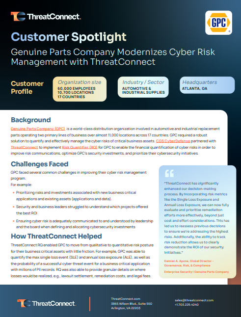 By employing ThreatConnect RQ, GPC can now prioritize security initiatives based on the financial impact of risks, ensuring budgets are allocated to projects offering the most significant reduction in financial risk. Ultimately, ThreatConnect empowered GPC to measure and communicate cyber risk, prioritize responses, justify budgets and spend allocation, and] make better informed investment decisions to manage their cybersecurity effectively