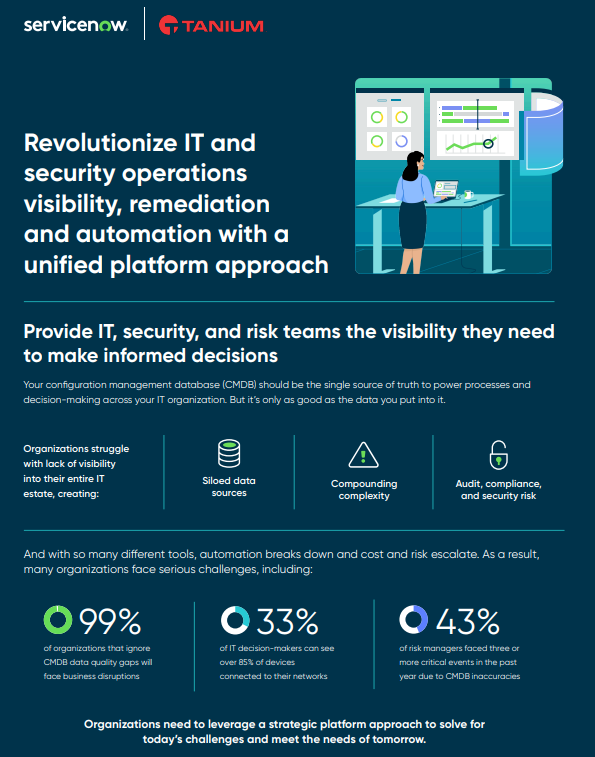 With Tanium Security Operations for ServiceNow, you can unify IT, security, and risk teams in ServiceNow to proactively identify, prioritize, and remediate risk from vulnerabilities, unauthorized changes, non-compliant configurations, and security incidents with end-to-end automation and orchestration.