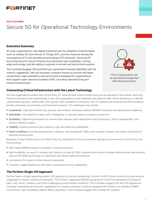 Renewable energy resources are often located in remote or extreme conditions. High-yielding wind and solar locations can be hot, cold, dusty, mountainous, or dry. Because of the portability of solar panels and wind turbines, solar and wind sites may be buildable but don’t necessarily have network connectivity. A site may be unconnected, or the connection may be unreliable. However, continuous operational data and controls are necessary to optimize energy production. The build-out of 5G cellular wireless technology, with its extended range and bandwidth, makes connections to remote sites a reality. With embedded 5G cellular wireless modems in a dual SIM or dual modem setup, the FortiGate Rugged appliances ensure failover and high availability capabilities to operational sites to optimize production.