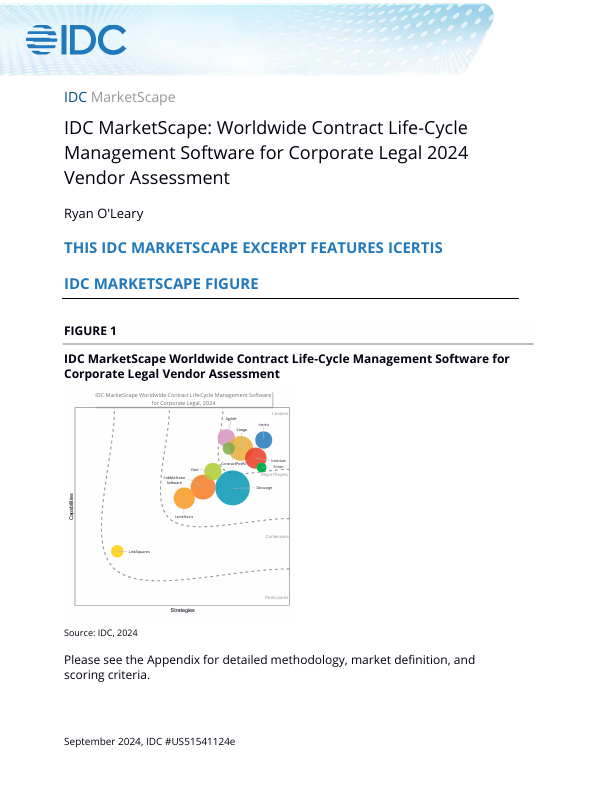 This IDC study represents the vendor assessment model called IDC MarketScape. This research is a quantitative and qualitative assessment of the characteristics that explain a vendor’s success in the marketplace and help anticipate the vendor’s ascendancy. This study assesses the capability and business strategy of many of the worldwide contract life-cycle management (CLM) software markets with a focus on functionality for the corporate legal department. This vendor evaluation is based on a comprehensive criterion expected to be most conducive to success in providing tools to enable contract generation, risk analysis, contract negotiation, review, workflow routing, and more to support enterprise legal departments both in the short term and in the long term. Corporate legal has specific needs within the CLM workflow that is different from the overall user. Customers within legal that were interviewed for this research indicated that leaders in this space tailor to their needs specifically and lessen the legal workload to enable legal to refocus on high-value work.