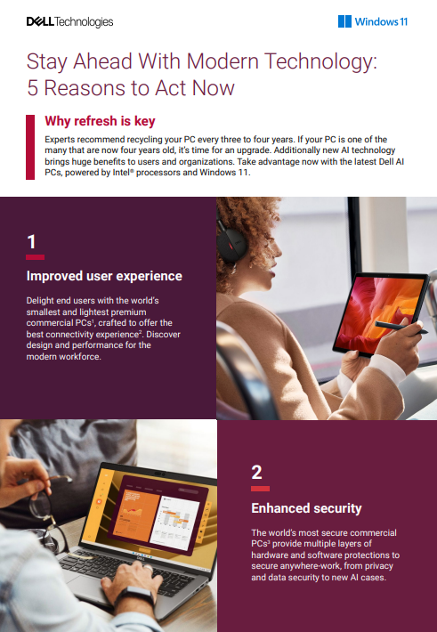 Experts recommend recycling your PC every three to four years. If your PC is one of the many that are now four years old, it’s time for an upgrade. Additionally new AI technology brings huge benefits to users and organizations. Take advantage now with the latest Dell AI PCs, powered by Intel® processors and Windows 11