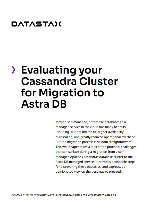 It is not uncommon for large enterprises to periodically change some or all of their underlying database technologies. This, of course, requires moving data and applications from one database to another. As this process can be complex, we wanted to provide this document as a way to ease the process of moving from a self-managed Cassandra implementation to a managed service like Astra DB.