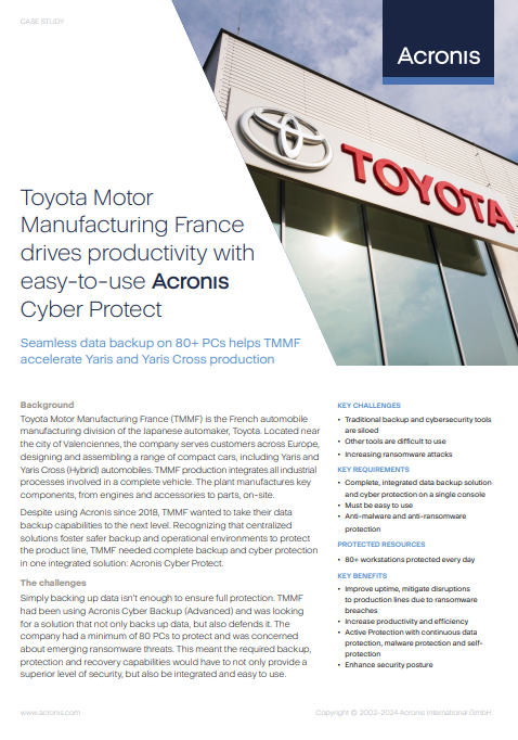 Toyota Motor Manufacturing France drives productivity with easy-to-use Acronis Cyber Protect