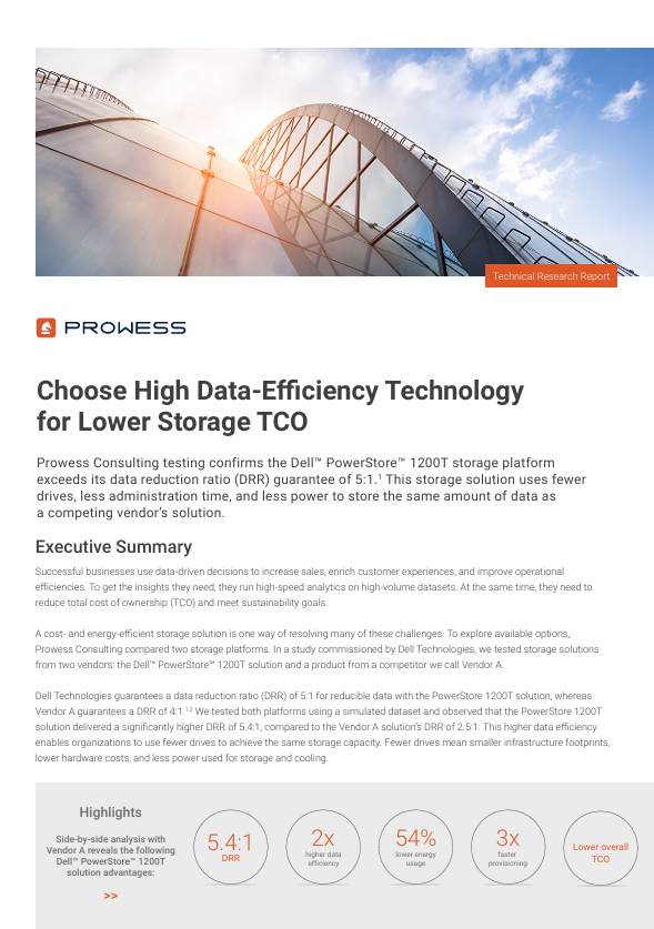 Prowess Consulting testing confirms the Dell™ PowerStore™ 1200T storage platform exceeds its data reduction ratio (DRR) guarantee of 5:1.1 This storage solution uses fewer drives, less administration time, and less power to store the same amount of data as a competing vendor’s solution.