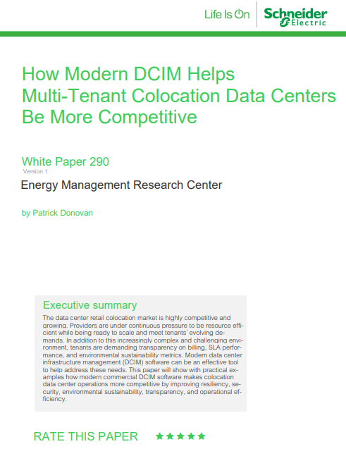 The data center retail colocation market is highly competitive and growing. Providers are under continuous pressure to be resource efficient while being ready to scale and meet tenants’ evolving demands. In addition to this increasingly complex and challenging environment, tenants are demanding transparency on billing, SLA performance, and environmental sustainability metrics. Modern data center infrastructure management (DCIM) software can be an effective tool to help address these needs. This paper will show with practical examples how modern commercial DCIM software makes colocation data center operations more competitive by improving resiliency, security, environmental sustainability, transparency, and operational efficiency.