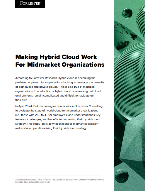 According to Forrester Research, hybrid cloud is becoming the preferred approach for organizations looking to leverage the benefits of both public and private clouds.1 This is also true of midsized organizations. The adoption of hybrid cloud is increasing but cloud environments remain complicated and difficult to navigate on their own. In April 2024, Dell Technologies commissioned Forrester Consulting to evaluate the state of hybrid cloud for midmarket organizations (i.e., those with 250 to 4,999 employees) and understand their key features, challenges, and benefits for improving their hybrid cloud strategy. This study looks at what challenges midmarket decisionmakers face operationalizing their hybrid cloud strategy