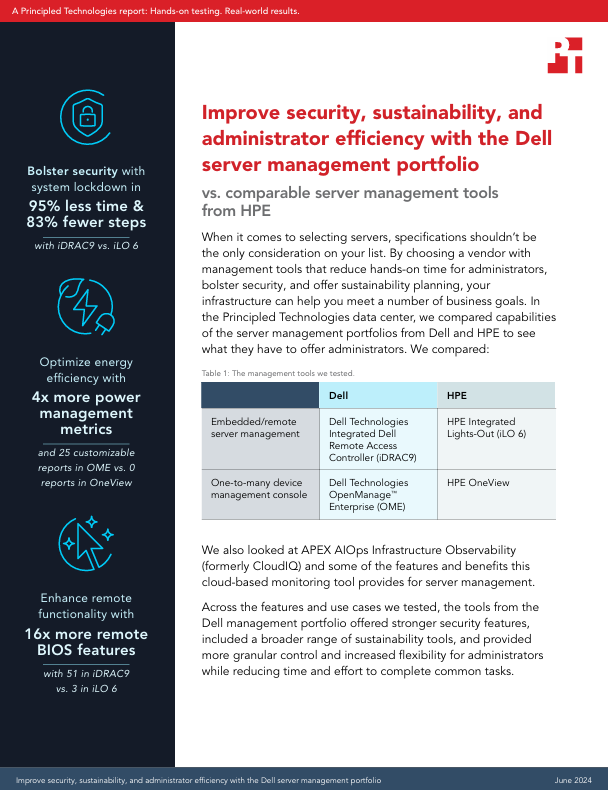 When it comes to selecting servers, specifications shouldn’t be the only consideration on your list. By choosing a vendor with management tools that reduce hands-on time for administrators, bolster security, and offer sustainability planning, your infrastructure can help you meet a number of business goals. In the Principled Technologies data center, we compared capabilities of the server management portfolios from Dell and HPE to see what they have to offer administrators.