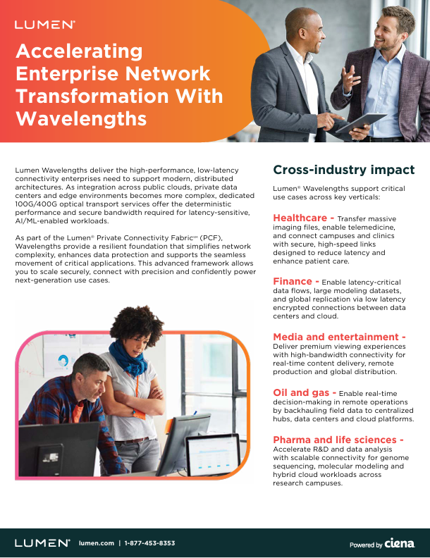 Lumen Wavelengths deliver the high-performance, low-latency connectivity enterprises need to support modern, distributed architectures. As integration across public clouds, private data centers and edge environments becomes more complex, dedicated 100G/400G optical transport services offer the deterministic performance and secure bandwidth required for latency-sensitive, AI/ML-enabled workloads.