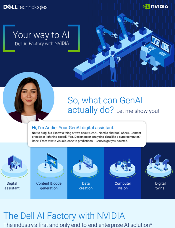 Wondering how we make GenAI work for you? The Dell AI Factory with NVIDIA is the industry’s first and only end-to-end enterprise AI solution, designed to speed AI adoption by delivering integrated Dell and NVIDIA capabilities to accelerate your AI-powered use cases, integrate your data and workflows, and enable you to design your own AI journey for repeatable, scalable outcomes.