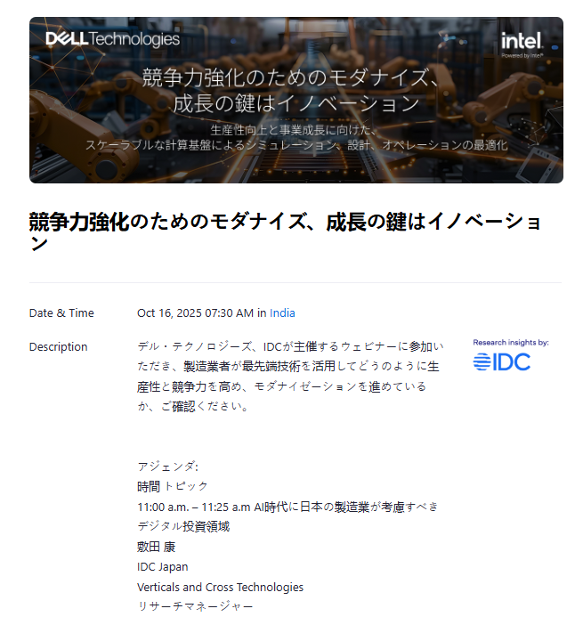 デル・テクノロジーズ、IDCが主催するウェビナーに参加いただき、製造業者が最先端技術を活用してどうのように生産性と競争力を高め、モダナイゼーションを進めているか、ご確認ください。