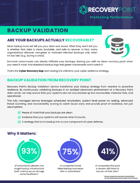 Recovery Point’s Backup Validation service transforms your backup strategy from reactive to proactive resilience. By continuously validating backups in an isolated cleanroom environment at a Recovery Point data center, we help ensure that your systems are not only backed up but recoverable, malware-free, and operational. This fully managed service leverages scheduled rehydration, system-level power-on testing, advanced threat scanning, and recoverability scoring to catch issues early and provide proof of resilience, not just assumptions.