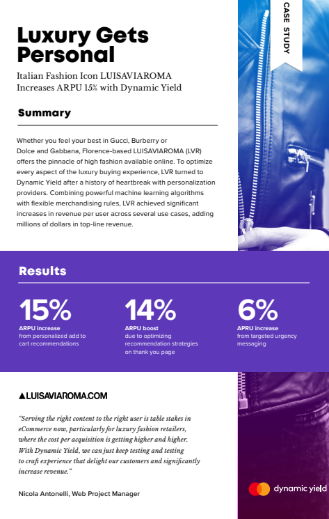 Whether you feel your best in Gucci, Burberry or Dolce and Gabbana, Florence-based LUISAVIAROMA (LVR) offers the pinnacle of high fashion available online. To optimize every aspect of the luxury buying experience, LVR turned to Dynamic Yield after a history of heartbreak with personalization providers. Combining powerful machine learning algorithms with flexible merchandising rules, LVR achieved significant increases in revenue per user across several use cases, adding millions of dollars in top-line revenue