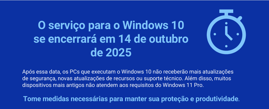 Após essa data, os PCs que executam o Windows 10 não receberão mais atualizações de segurança, novas atualizações de recursos ou suporte técnico. Além disso, muitos dispositivos mais antigos não atendem aos requisitos do Windows 11 Pro.