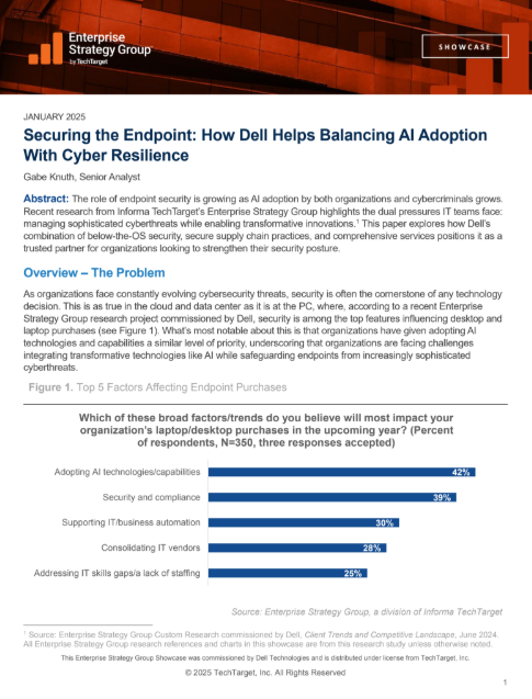 As organizations face constantly evolving cybersecurity threats, security is often the cornerstone of any technology decision. This is as true in the cloud and data center as it is at the PC, where, according to a recent Enterprise Strategy Group research project commissioned by Dell, security is among the top features influencing desktop and laptop purchases (see Figure 1). What’s most notable about this is that organizations have given adopting AI technologies and capabilities a similar level of priority, underscoring that organizations are facing challenges integrating transformative technologies like AI while safeguarding endpoints from increasingly sophisticated cyberthreats.