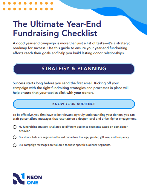 Neon One connects nonprofits with the technology and resources that empower them to build a community of generosity. We believe that small to midsize nonprofits thrive when enabled with a platform designed to create magical generosity experiences.