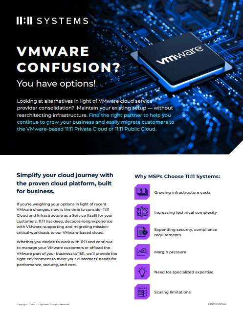 If you’re weighing your options in light of recent VMware changes, now is the time to consider 11:11 Cloud and Infrastructure as a Service (IaaS) for your customers. 11:11 has deep, decades-long experience with VMware, supporting and migrating missioncritical workloads to our VMware-based cloud. Whether you decide to work with 11:11 and continue to manage your VMware customers or offload the VMware part of your business to 11:11, we’ll provide the right environment to meet your customers’ needs for performance, security, and cost