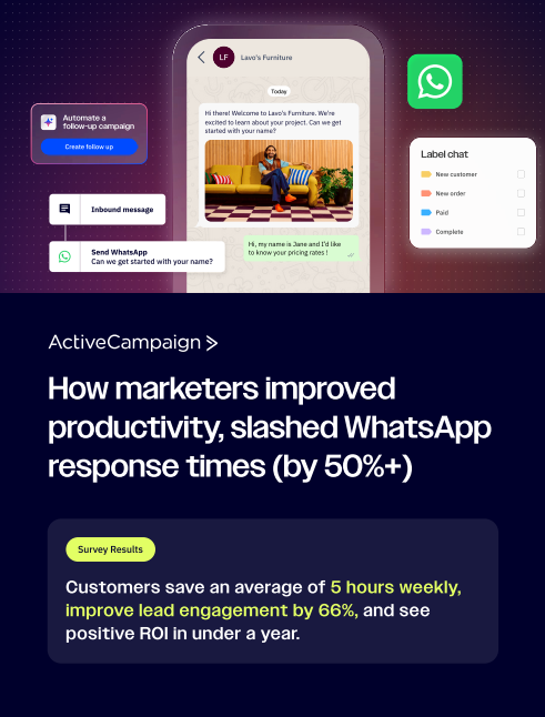 ActiveCampaign customers benefit from more efficient response times. With ActiveCampaign WhatsApp Messaging, only 6% spend 20+ hours a week on follow-ups (down from 14%), while 76% spend less than 10 hours weekly on chats.  Over half (52%) reduced their response times by 50% or more, and nearly 1 in 4 (22%) achieved 25 50% improvements.