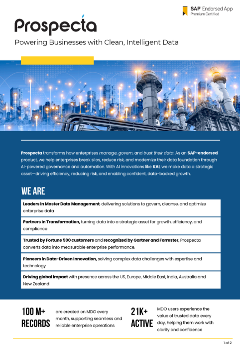 Prospecta transforms how enterprises manage, govern, and trust their data. As an SAP-endorsed product, we help enterprises break silos, reduce risk, and modernize their data foundation through AI-powered governance and automation. With AI innovations like KAI, we make data a strategic asset—driving efficiency, reducing risk, and enabling confident, data-backed growth.