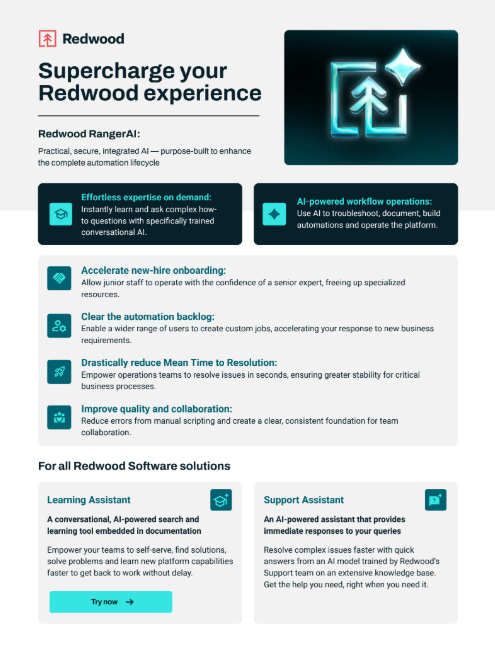 Your data remains private. Redwood only passes minimal, task-specific data (like an error code), ensuring your sensitive business information is never exposed. Redwood’s AI models are trained for your specific use cases, providing relevant scripting and error resolution advice, unlike generic AI tools. Redwood RangerAI enhancements are woven into the platform for a frictionless user experience that enhances productivity without disruption.