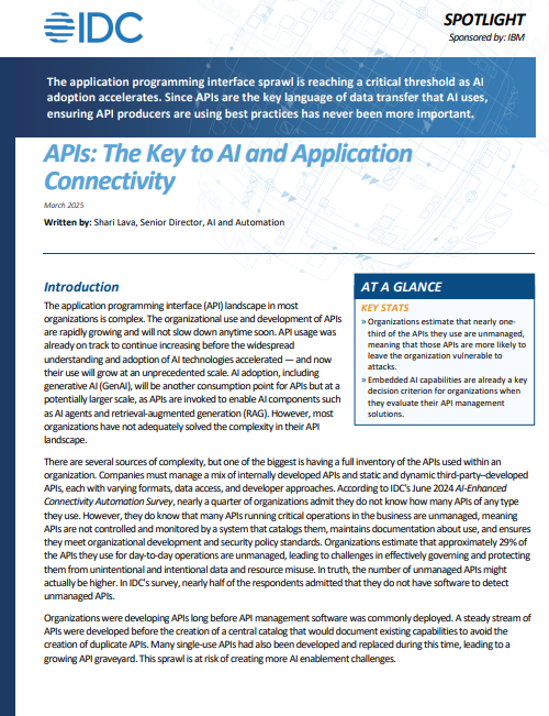 The application programming interface (API)landscape in most organizations is complex. The organizational use and development of APIs are rapidly growing and will not slow down anytime soon. API usage was already on track to continue increasing before the widespread understanding and adoption of AI technologies accelerated—and now their use will grow at an unprecedented scale. AI adoption, including generative AI(GenAI), will be another consumption point for APIs but at a potentially larger scale, as APIs are invoked to enable AI components such as AI agents and retrieval-augmented generation (RAG).However,most organizations have not adequately solved the complexity in their API landscape.