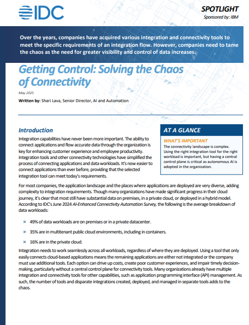 Integration capabilities have never been more important. The ability to connect applications and flow accurate data through the organization is key for enhancing customer experience and employee productivity. Integration tools and other connectivity technologies have simplified the process of connecting applications and data workloads. It’s now easier to connect applications than ever before, providing that the selected integration tool can meet today’s requirements. For most companies, the application landscape and the places where applications are deployed are very diverse, adding complexity to integration requirements. Though many organizations have made significant progress in their cloud journey, it’s clear that most still have substantial data on premises, in a private cloud, or deployed in a hybrid model. According to IDC’sJune 2024 AI-Enhanced Connectivity Automation Survey,the following is the average breakdown of data workloads.