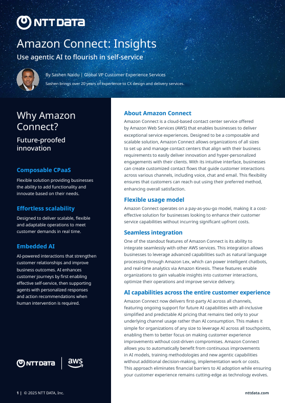 Amazon Connect is a cloud-based contact center service offered by Amazon Web Services (AWS) that enables businesses to deliver exceptional service experiences. Designed to be a composable and scalable solution, Amazon Connect allows organizations of all sizes to set up and manage contact centers that align with their business requirements to easily deliver innovation and hyper-personalized engagements with their clients. With its intuitive interface, businesses can create customized contact flows that guide customer interactions across various channels, including voice, chat and email. This flexibility ensures that customers can reach out using their preferred method, enhancing overall satisfaction.