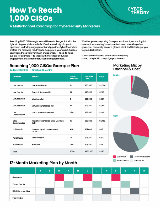 Reaching 1,000 CISOs might sound like a challenge. But with the right strategy and channel mix, it’s a focused, high-impact approach to driving engagement and pipeline. CyberTheory has crafted the following roadmap to help you in your quest. Tactics span from those with very high engagement — face-to-face events, for example — to those with more top-of-funnel engagement but wider reach, such as digital media.